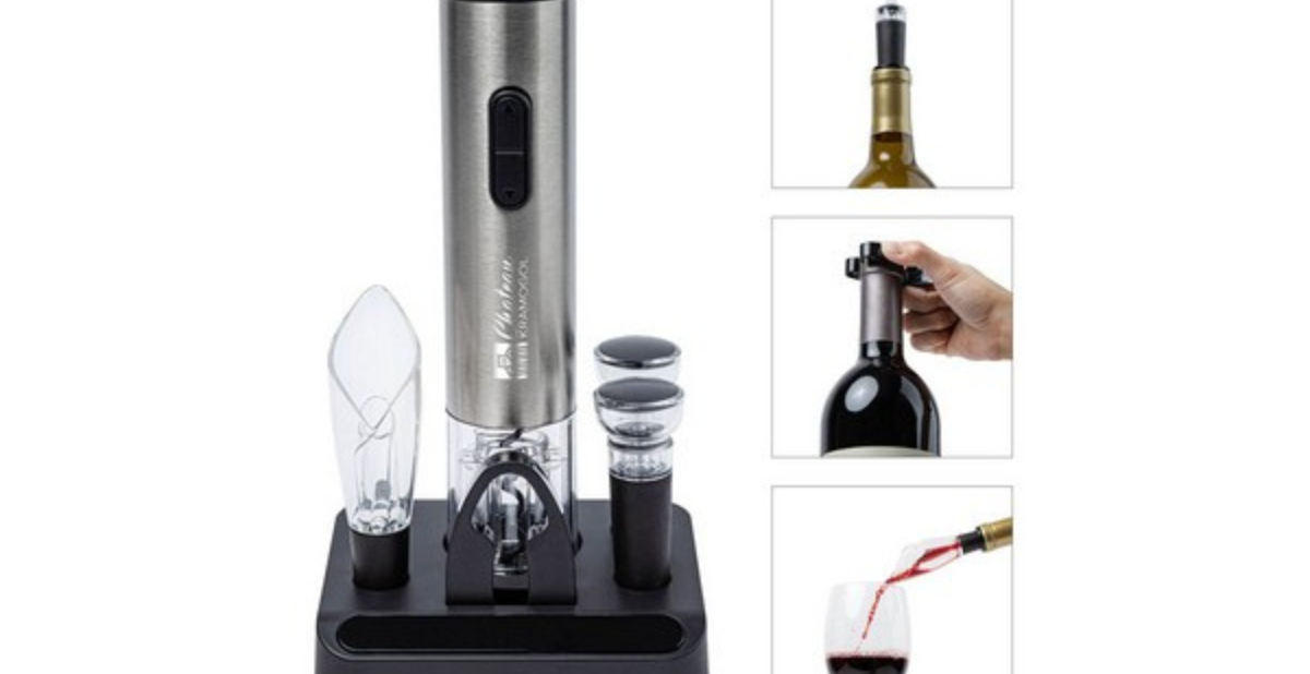 Product idea: The six-piece Carignan Electric Wine Set is a perfect home gift for any occasion. This six-in-one wine set includes one electric corkscrew wine opener, one wine aerator pourer, one seal cutter, two vacuum stoppers and a base for storage. The wine aerator pourer enhances the taste of the wine, while the vacuum stoppers help to preserve the wine much longer than a standard bottle stopper.