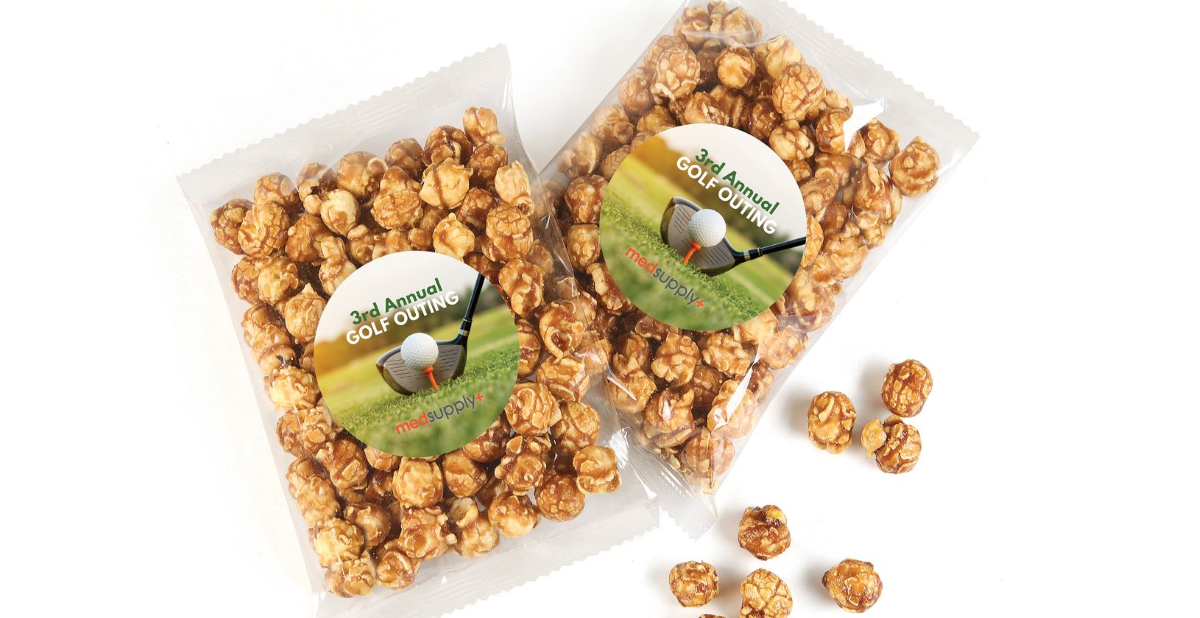 Product Idea: Satisfy your sweet tooth and celebrate with custom-branded bags of Copper Kettle Caramel Corn, a rich, traditional caramel popcorn cooked in real copper kettles from scratch. Made in the USA. Each snack-sized bag is 3.75 oz., with a four-color process imprint on a 2.75-inch round label.