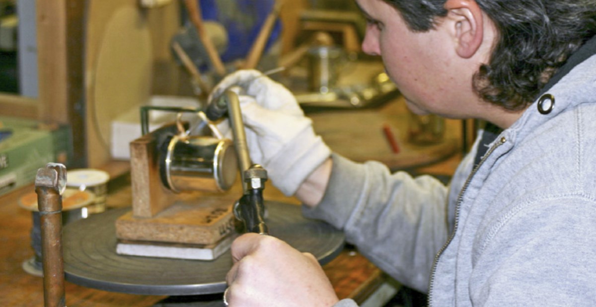 The item is then transferred to a solderer, who pieces together parts of the item, like bases and handles, using a solder.