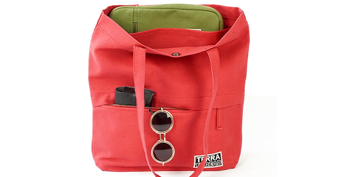 The Organic Cotton Dunia Tote Bag is a great everyday carryall made from durable and sustainably grown fair trade organic cotton canvas. The 16x11-inch bag features sturdy handles, an internal divider and a large zippered external pocket. Snap and zippers are lead-free. Available in 10 colors (red shown). Each purchase also supports Feeding America.