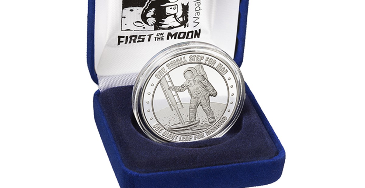 Above photo: Commemorated to recognize the 50th anniversary of the Apollo 11 Mission, this one-ounce, fine silver coin features Neil Armstrong stepping onto the moon, and the reverse image shows the Armstrong Air & Space Museum in Wapakoneta, Ohio. Five-hundred of the limited-edition coins were made.