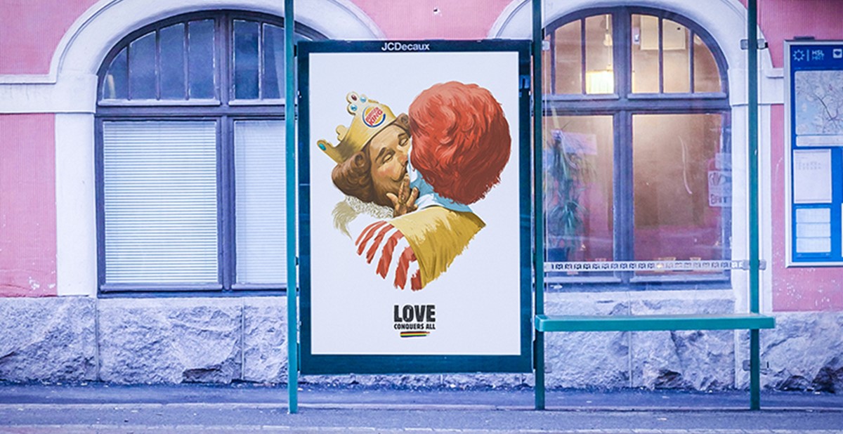 More than 2,000 years ago, Publous Vergilous Maro, a Roman poet known as Virgil, was onto something when he wrote, “Love conquers all.” Still holding true more than 20 centuries later, “Love conquers all” was the tagline in Burger King Finland’s marketing campaign to celebrate Helsinki Pride in Helsinki, Finland. The campaign featured a cartoon rendering of The Burger King, the fast-food chain's mascot, embracing rival McDonald’s mascot, Ronald McDonald, with a kiss, the shape of their heads forming a heart. Created in partnership with Burger King Finland’s creative team, TBWA\Helsinki and Virta Helsinki, the campaign included both print and outdoor advertisements throughout the city, and in local Burger King restaurants and other channels. Helsinki Pride is normally held during the last week of June in accordance with Pride Month but was delayed to September 7-13 due to coronavirus. This year, Burger King Finland was Helsinki Pride’s official partner.