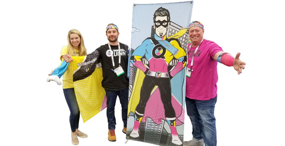 First, they considered what type of environment conveys color and heroic service. A cityscape and a comic book superhero, of course. The scene was a typical 30-foot inline booth. The marketing team created a full-color backlit cityscape backdrop accentuated with colorful paint drippings and a Quinn comic book superhero for participants to pose with. To carry through the theme, Quinn booth staffers dressed in t-shirts in basic CMYK (cyan, magenta, yellow and black) colors and waved fun cheer wear products. A steady stream of show attendees accepted the challenge to dress up and pose in superhero garb while staffers snapped photos and encouraged their posting to social media using the hashtag #QUINNfortheWin.