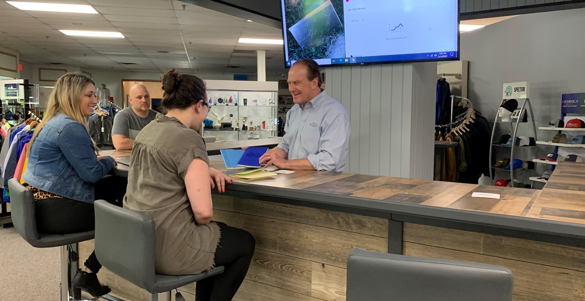 Gerry Barker (far right) discusses different notebook options with Art Carbone, Barker Specialty's director of manufacturing; Amy Serrano, CAS, director of marketing; and Kim Chandler, receptionist.