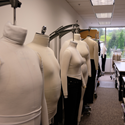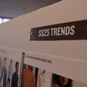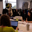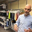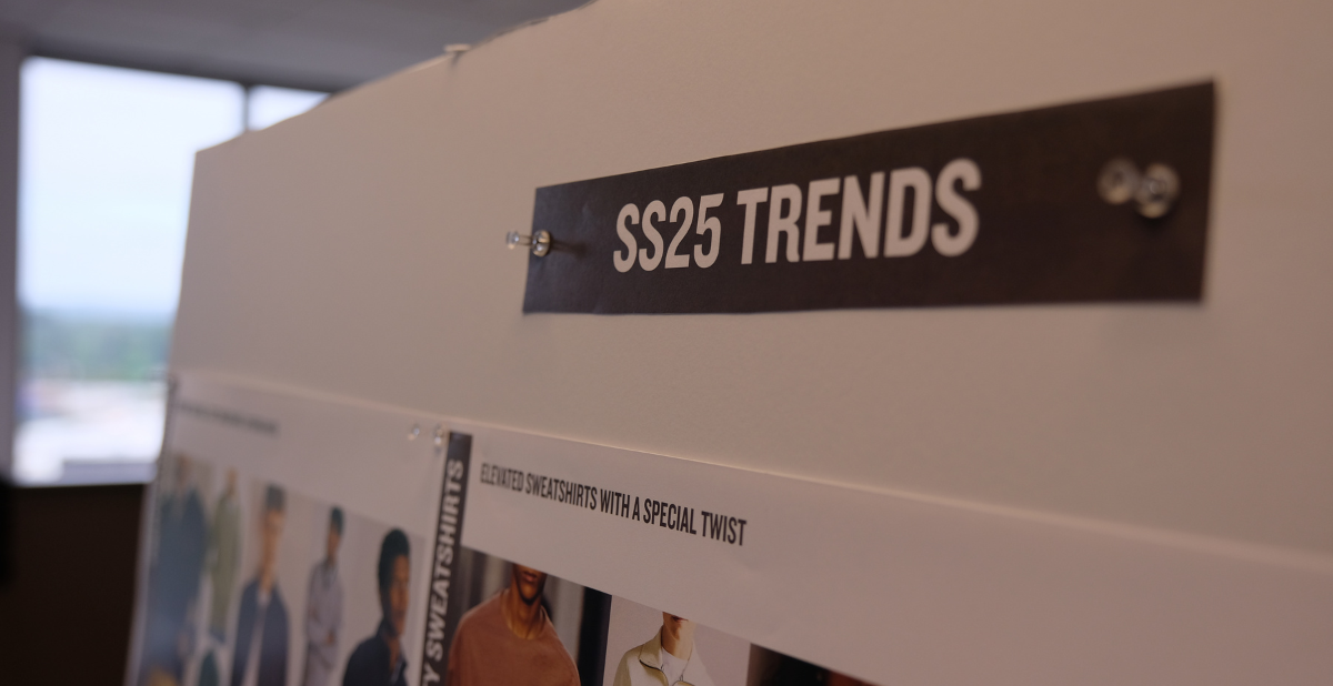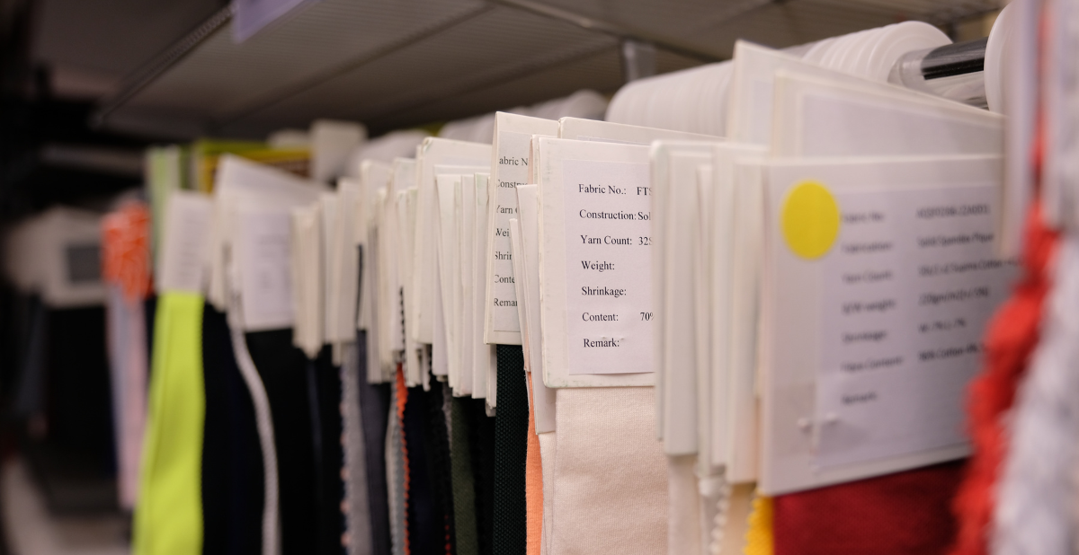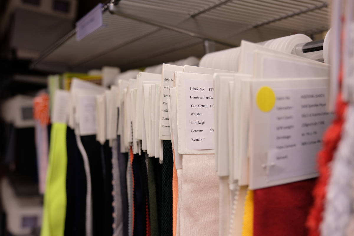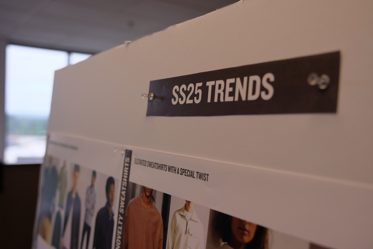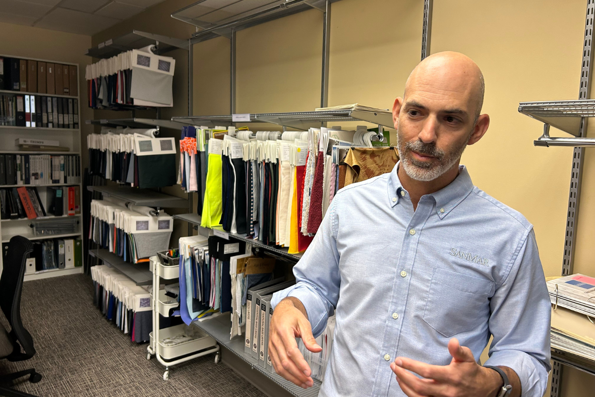 Giving a tour of the suburban hillside building to our PPAI Media contingent, he is versed on what is stored in each side closet and the work being done around every cubicle corner. Look, these are fabric swatches from the current product line. Over there is an inspiration board for spring 2025 fashions. This machine tests the color of fabric under different lighting. And here is how it works.