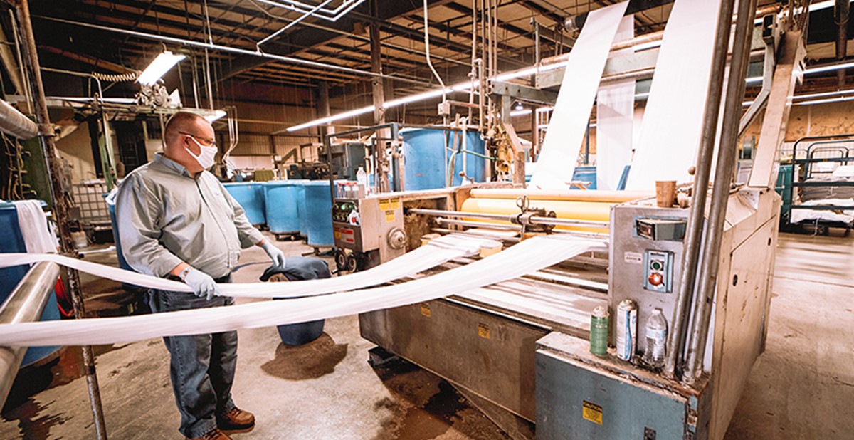 Hanes, which does business in the promotional products industry as Hanes/Champion based in Winston-Salem, North Carolina, is working with a consortium of companies including suppliers Sanmar (whose factory in Tennessee is shown here, in photos by Ryan McGill), Fruit of the Loom and AST Sportswear (part of Bayside Made in America). Together, the consortium worked to produce five to six million masks weekly using HanesBrands’s design and patterns.