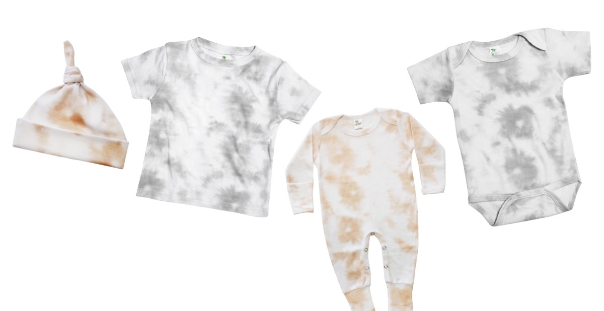 The tie-dye trend is still going strong with clothing for infants and children, and The Laughing Giraffe offers a large selection of infant pieces and toddler T-shirts in a pigment tie-dye pattern in neutral smoke or latte (both shown). These garments, made specifically for custom decoration, come in sizes newborn through youth XL.