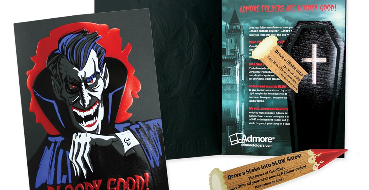 Admore’s vampire-themed “Bloody Good!” Halloween promotion won the Gold Award for the Folder category in the 2018 Gold Ink Awards competition sponsored by Printing Impressions magazine. This year’s Gold Ink Award winners were chosen from among nearly 600 entries submitted. Admore’s folder was printed in a four-color process, with foil colors and embossing. It included a custom die-cut “wooden stake” insert to complete the Halloween theme.