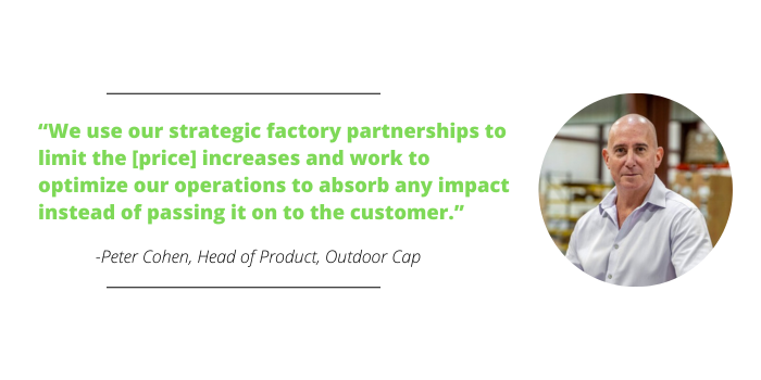 “Price increases have been the norm for several years with higher wages and inflationary pressure, but we use our strategic factory partnerships to limit the increases and work to optimize our operations to absorb any impact instead of passing it on to the customer,” says Peter Cohen, head of product at Outdoor Cap (PPAI 213485, S10) – ranked the No. 25 supplier in this year’s PPAI 100.