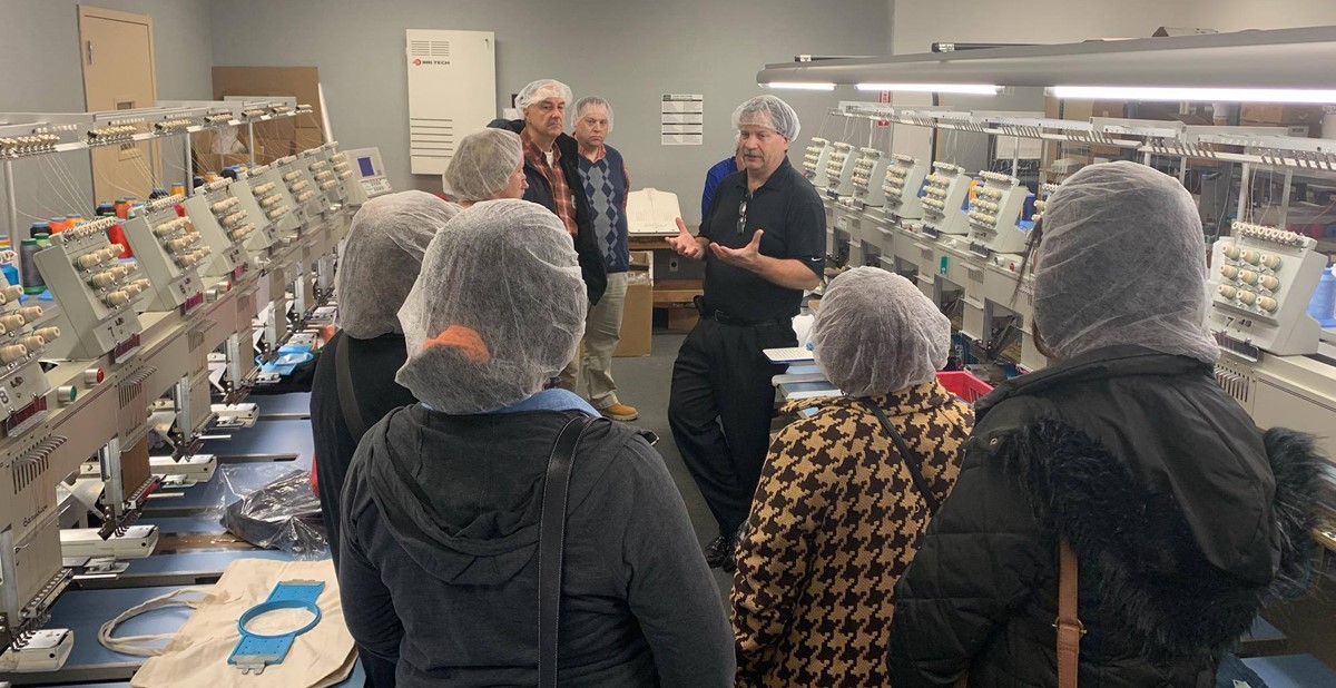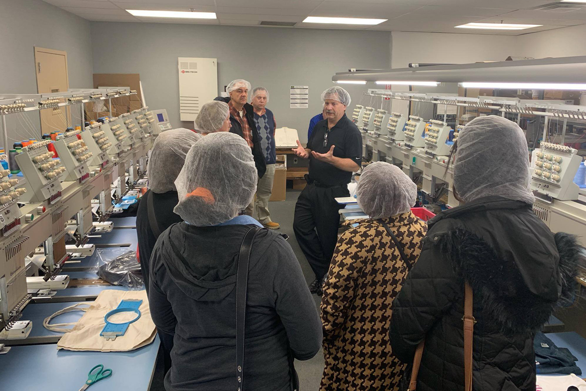 The group also had a chance to tour SPD/Shoreline’s apparel stitching and embroidery facility. Here, the conversation focused on the stitching process, and the need for modification of the logo depending upon the fabric type, which ensures clarity and quality of the end product. The final portion of the tour provided an overview on how the hardgoods and apparel created by SPD/Shoreline can be combined with the custom food products created by Chocolate Inn to create unique, highly personalized gift sets.