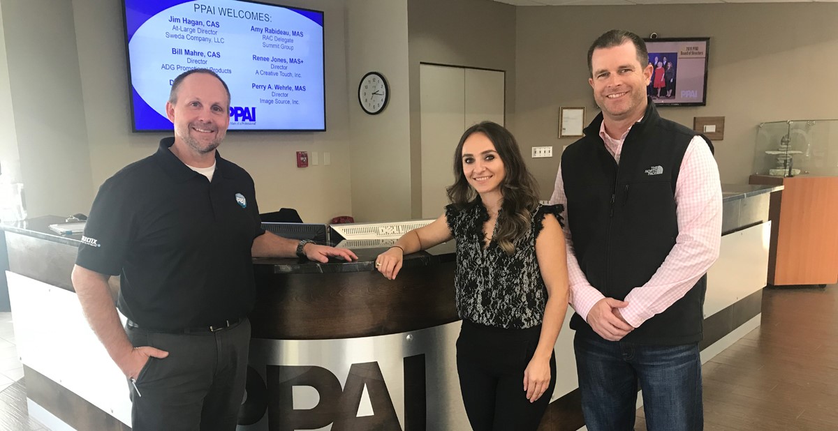 Above: Mike Fey, MAS, president and CEO of Fey Promo (left) and Aida Simmons, the supplier's Southeast territory sales manager, met with PPAI Business Development Account Manager Brandon Dunaway on their visit to PPAI headquarters.