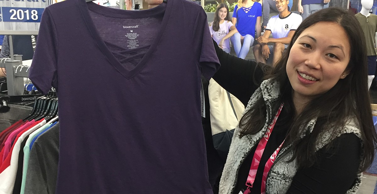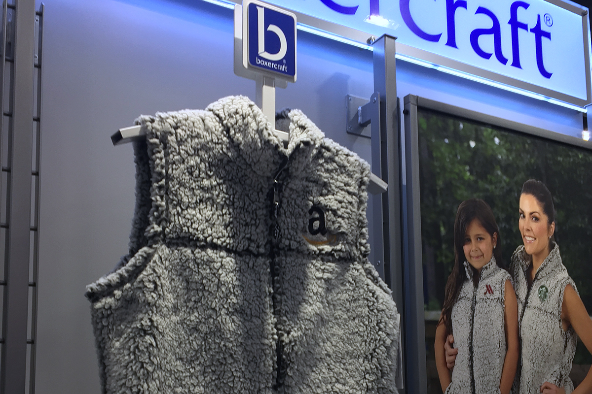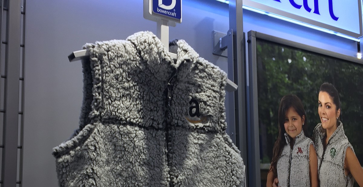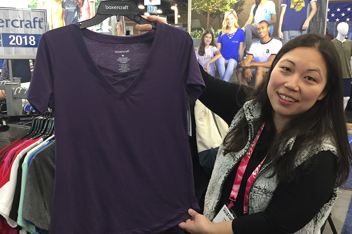 Other on-trend looks for women borrow from what’s popular at retail, including a criss-cross neckline, center back seam, rounded shirt hemlines, “cold shoulder” sleeve styles and ultra-warm, ultra-soft Sherpa-like fabrics for winter. Boxercraft is displaying a 100-percent polyester vest that looks straight out of the Himalayas.