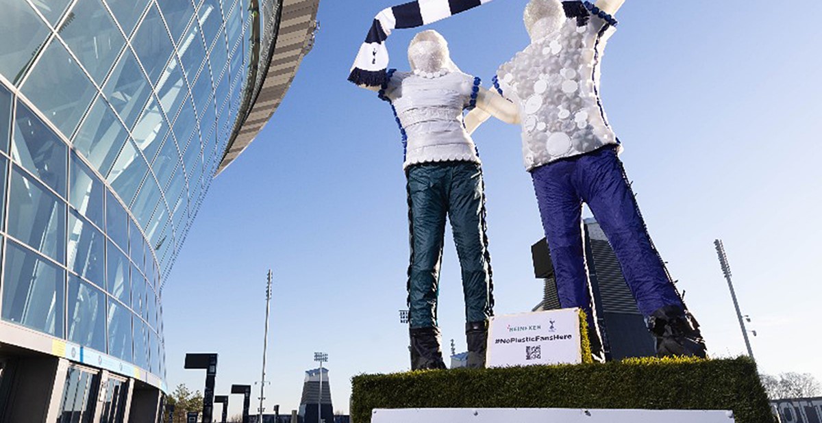 What can you make with 200 bottle caps, 75 plastic bottles, 20 plastic bags, 20 coffee cup lids and two abandoned tents? Using these post-consumer-recycled plastic materials and more, renowned sculptor Sarah Turner made two life-sized sculptures to represent two people, or fans, which Heineken UK commissioned to send a message to remind consumers to consider green practices.