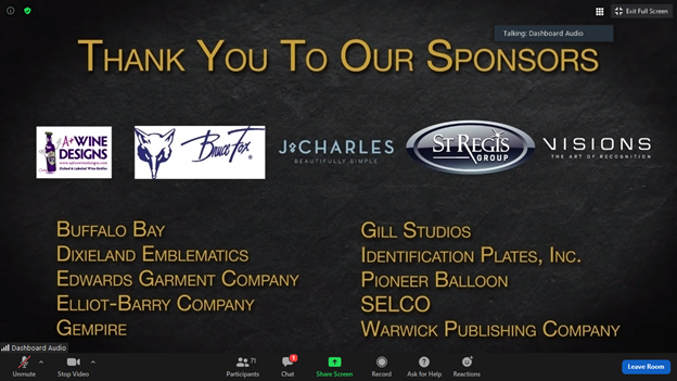 Ira Neaman, MAS, PPAI’s 2020 Board Chair, hosted the evening’s program. He noted in his opening remarks, “I am thrilled to ‘see’ all of you—our former PPAI chairs, our past and present board members, our tireless volunteers and PPAI staff. While this event isn’t the same, our gratitude tonight is perhaps greater than ever because the last year certainly taught us the value of our promo community. This is a people industry and that’s why this is one of my favorite nights of the year … a night when we can come together and celebrate the best of us. Our trailblazers, our philanthropists, our mentors and our industry icons. These remarkable people have each contributed to making our industry what it is today.”