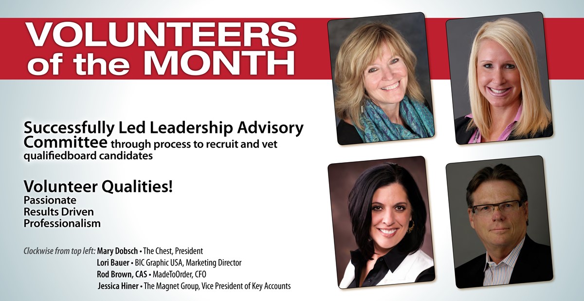 This month, PPAI recognizes PPAI Leadership Advisory Committee members Mary Dobsch, president of supplier The Chest; Lori Bauer, vice president, national accounts, at supplier BIC Graphic USA; Rod Brown, CAS, CFO at distributor MadeToOrder; and Jessica Hiner, vice president of key accounts at supplier The Magnet Group, as the September PPB Volunteers of the Month. The Association’s PPB Volunteers of the Month have dedicated their time to the progress and fulfilling the charge of a committee, advisory group, work group or task force on which they serve.