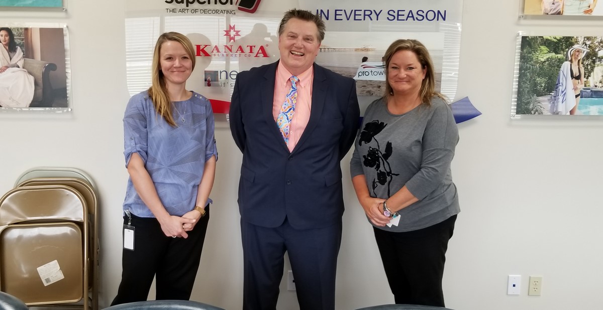 McLean met with Jennifer Reece, senior director of marketing (above left), and Melissa Mason, human resource manager, at Pittsburgh, Pennsylvania-headquartered Pro Towels’ Abbeville facility. Reece and Mason showed him around the almost 340,000 square-foot facility, where 150 staff members perform embroidery, screen printing and dye sublimation work for the company’s Pro Towels, Kanata Blankets and Superior Decorating brands.