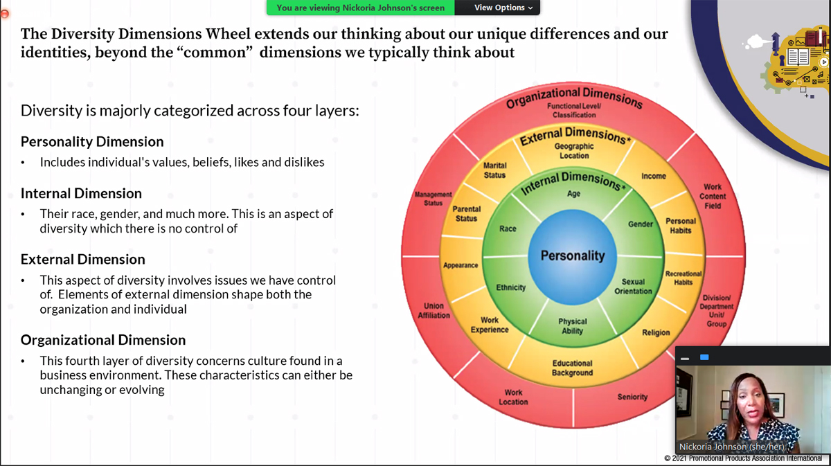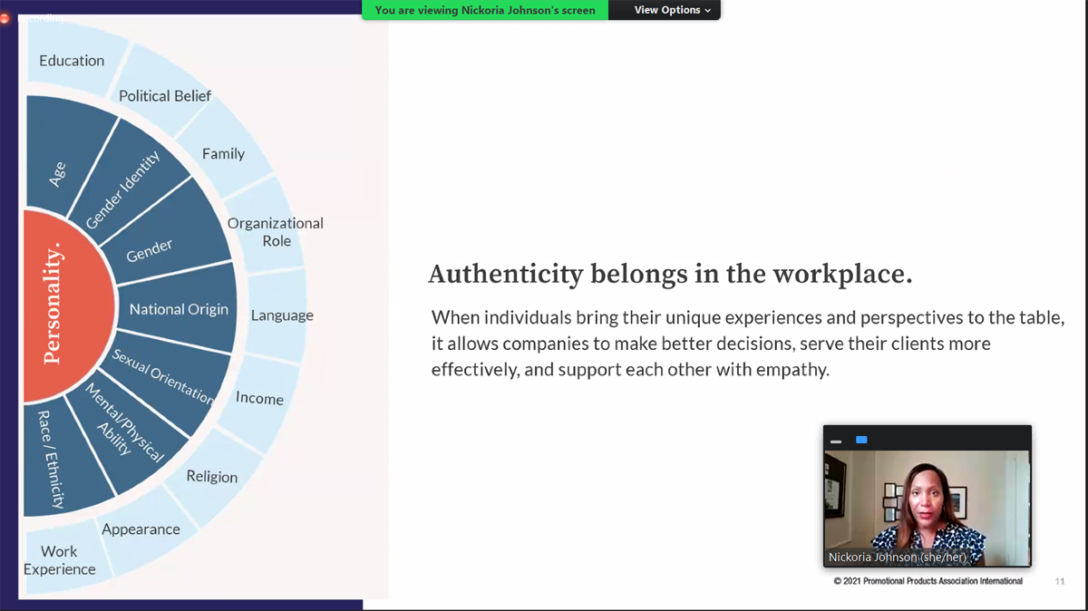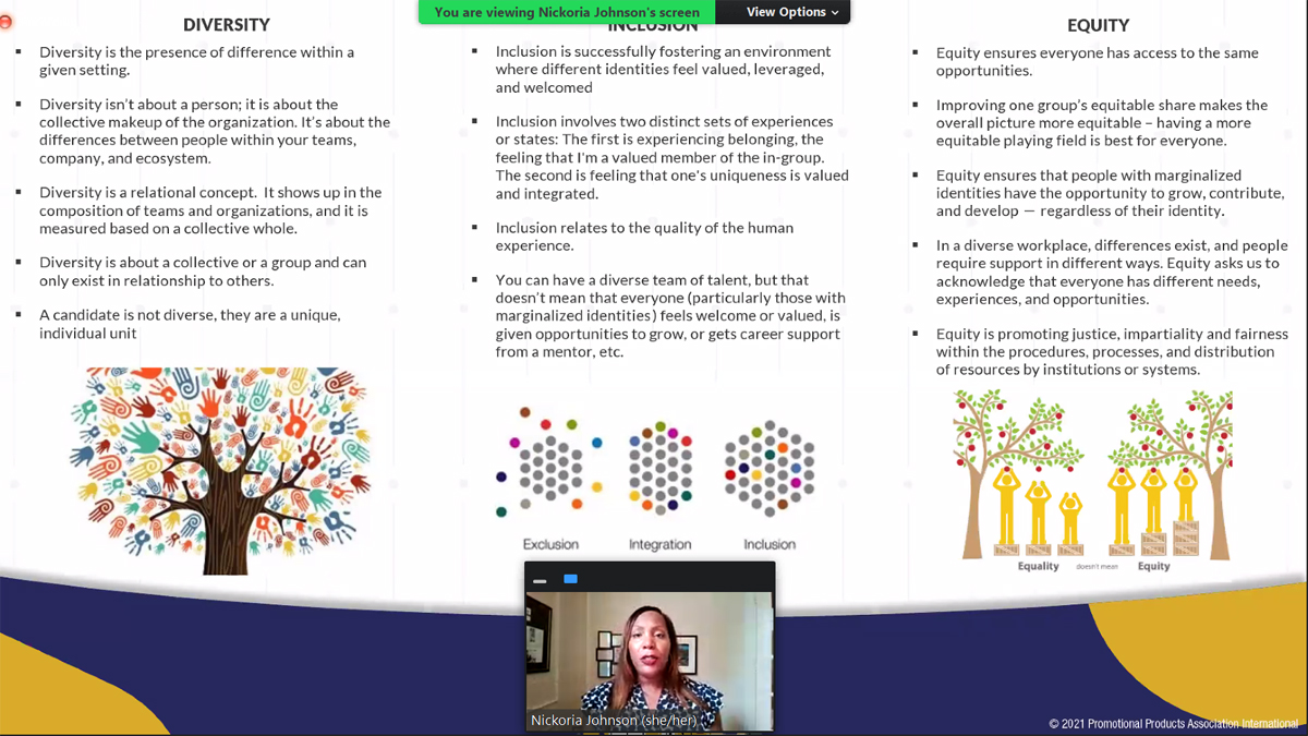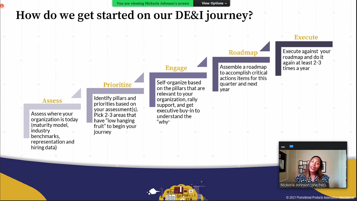 To be successful, diversity, equity and inclusion (DEI) initiatives can’t be buried underneath layers of an organization, but instead, must be among a C-level executive’s top priorities. It’s a must, says expert guest Nickoria Johnson in the first webinar of PPAI’s new and ongoing DEI series. On October 12, the series kicked off with a one-hour session, “Building A DEI Framework For Your Organization,” that shared actionable next steps and a guide for businesses as they build their unique DEI roadmap.