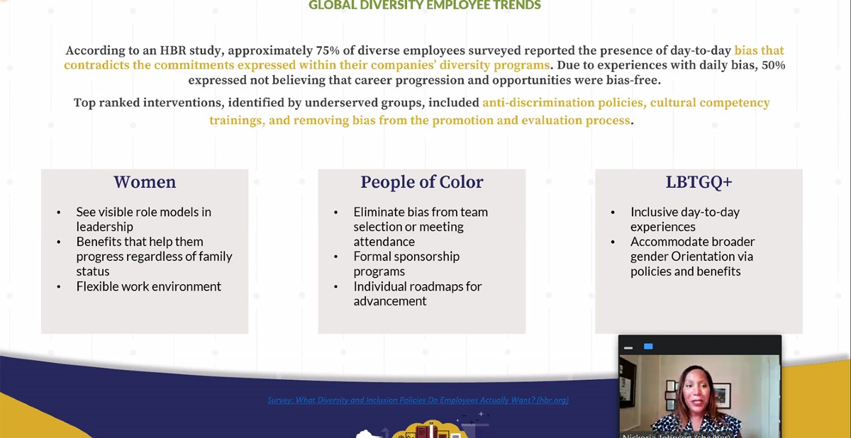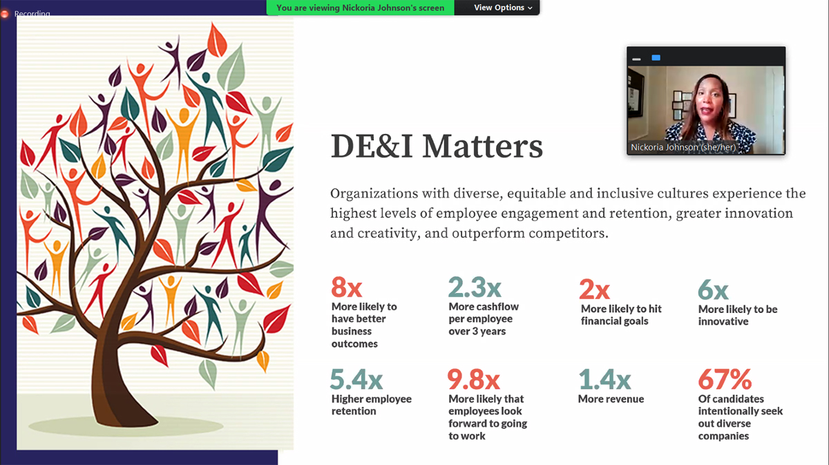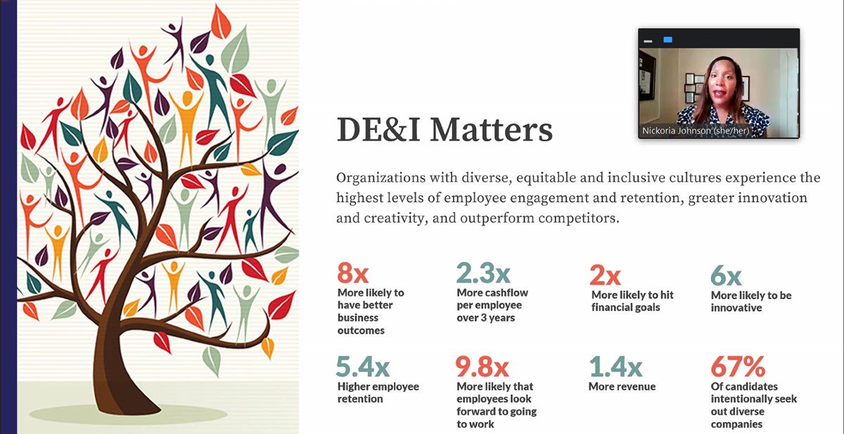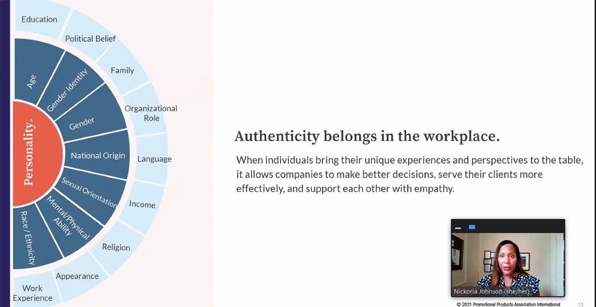 To be successful, diversity, equity and inclusion (DEI) initiatives can’t be buried underneath layers of an organization, but instead, must be among a C-level executive’s top priorities. It’s a must, says expert guest Nickoria Johnson in the first webinar of PPAI’s new and ongoing DEI series. On October 12, the series kicked off with a one-hour session, “Building A DEI Framework For Your Organization,” that shared actionable next steps and a guide for businesses as they build their unique DEI roadmap.