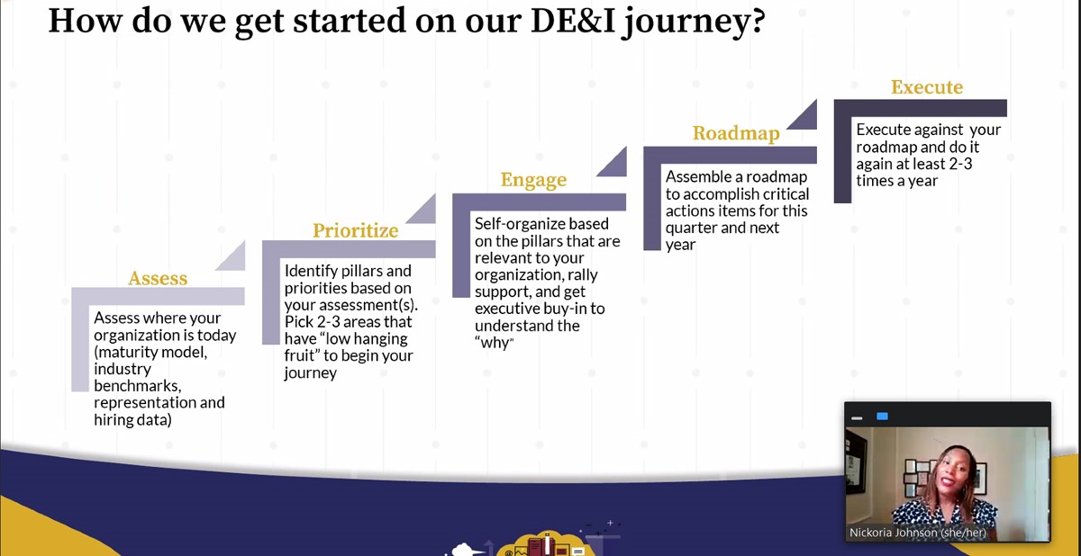 For companies looking to start building their unique DEI framework, Johnson says to first access where the organization is today. In this session, she offers evaluation methods like a maturity model, industry benchmarks and hiring and representation data. Next, businesses can prioritize areas of focus and engage employees and executives. After assembling a roadmap of critical actions, the DEI framework can be executed. Johnson says businesses should constantly track progress and refine its DEI plan.