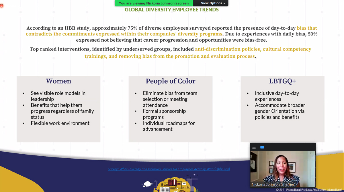 PPAI’s Professional Development Manager Pamela Brown-Matthis moderated this education session, introducing Johnson as speaker. Johnson has over 25 years of experience in technology leadership, management consulting and portfolio management, and she is currently chief diversity officer at consulting firm, Credera. Brown-Matthis says, “A true commitment to diversity, equity and inclusion in the workplace starts with building a strong framework. This webinar provides attendees with a solid foundation for building a strong DEI program. The session is informative, thought provoking and application-oriented.”