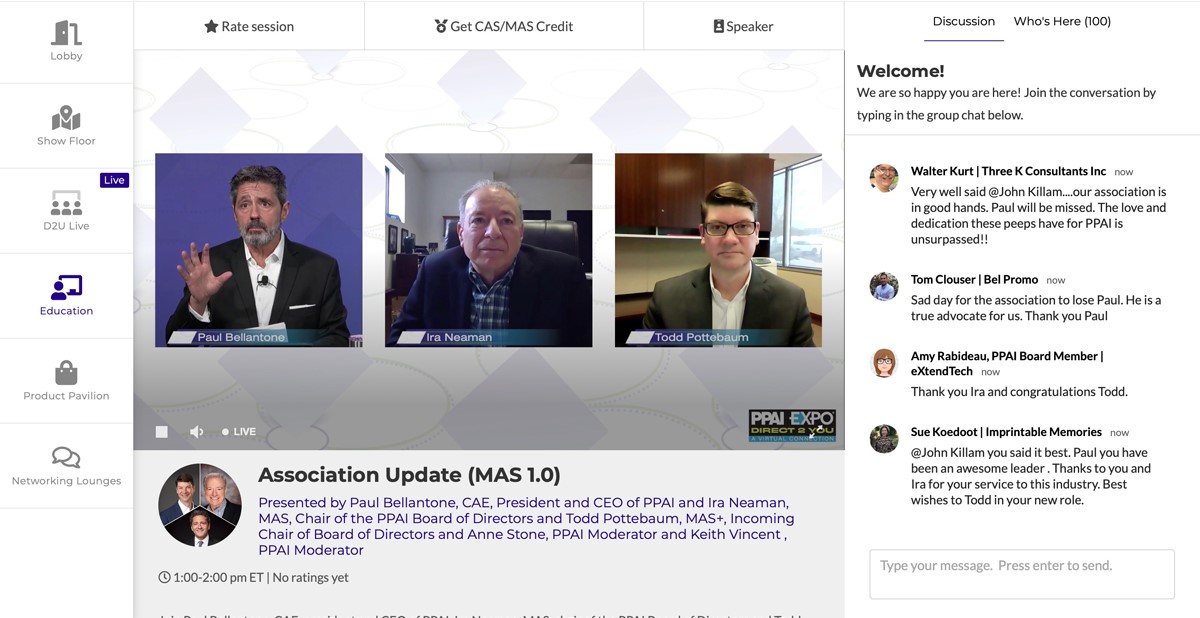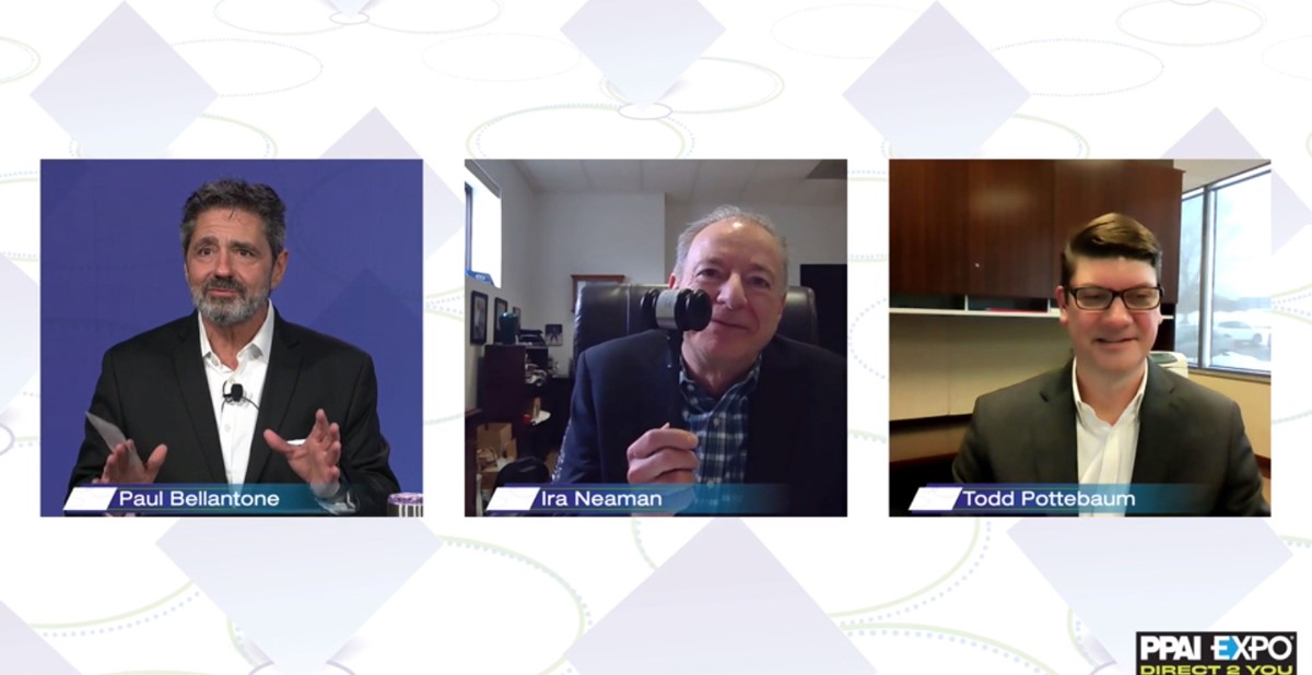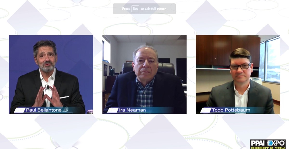 On Wednesday, PPAI hosted its annual Association Update in a live format as part of PPAI Expo Direct-2-You, which featured a virtual, informative conversation among PPAI leaders on updates and changes made to the Association and its services over the past year; trends and issues affecting the state of the promotional products industry today, and growth opportunities for PPAI’s member companies and the industry as a whole. The chat led by PPAI President and CEO Paul Bellantone, CAE, featured Ira Neaman, MAS, the outgoing chair of PPAI’s Board of Directors, and founder and president of supplier Vantage Apparel; and Todd Pottebaum, MAS+, incoming PPAI board chair and president of distributor Quality Resource Group (QRG). The conversation also included a virtual “passing of the gavel” from Neaman to Pottebaum, and covered the heavy, yet unavoidable, topics of the COVID-19 pandemic and its effect on business, the move to make Expo virtual this year and their projections for the industry’s future.