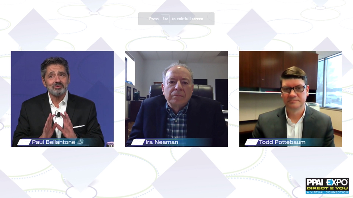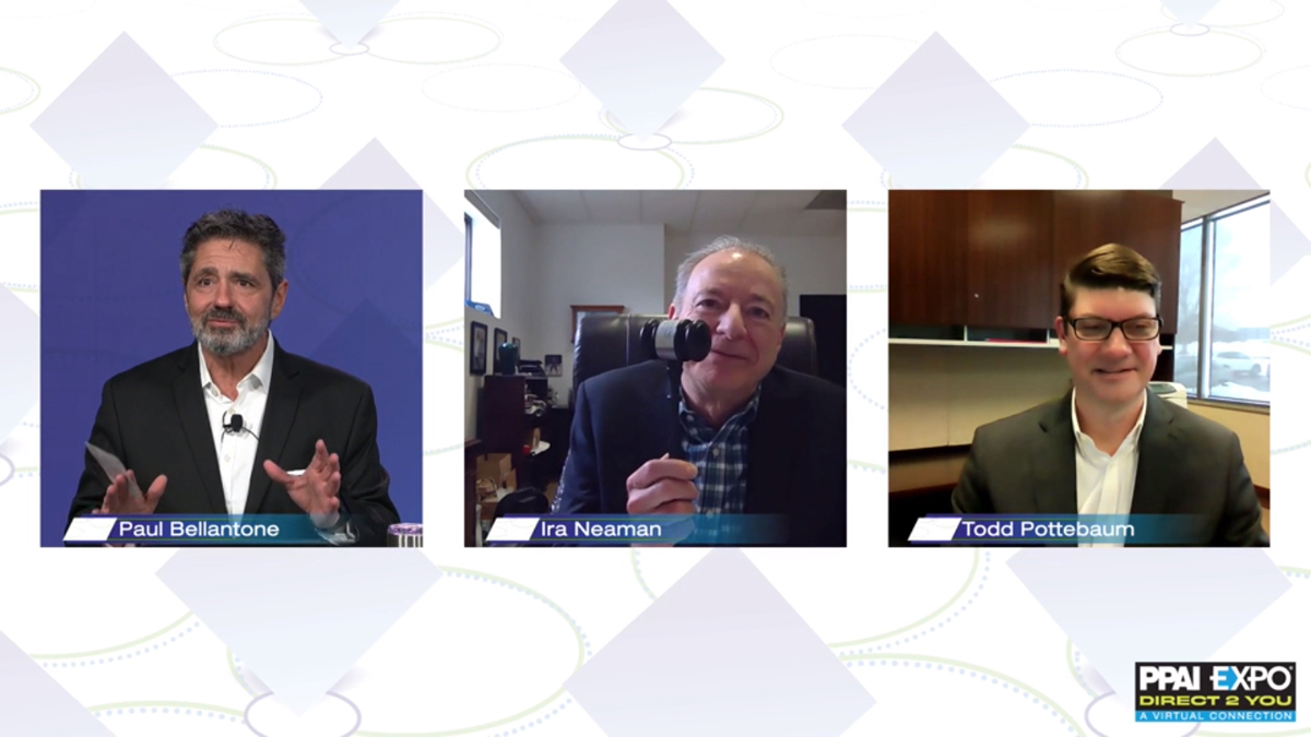 On Wednesday, PPAI hosted its annual Association Update in a live format as part of PPAI Expo Direct-2-You, which featured a virtual, informative conversation among PPAI leaders on updates and changes made to the Association and its services over the past year; trends and issues affecting the state of the promotional products industry today, and growth opportunities for PPAI’s member companies and the industry as a whole. The chat led by PPAI President and CEO Paul Bellantone, CAE, featured Ira Neaman, MAS, the outgoing chair of PPAI’s Board of Directors, and founder and president of supplier Vantage Apparel; and Todd Pottebaum, MAS+, incoming PPAI board chair and president of distributor Quality Resource Group (QRG). The conversation also included a virtual “passing of the gavel” from Neaman to Pottebaum, and covered the heavy, yet unavoidable, topics of the COVID-19 pandemic and its effect on business, the move to make Expo virtual this year and their projections for the industry’s future.