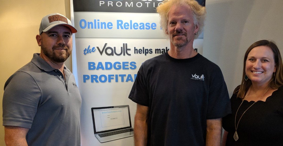While at Vault Promotions, Tucker (above right) spoke with the company’s owner, Josh Robbins (above left, with co-owner Andy Logan), about the business and how it has established itself in the promotional products market.