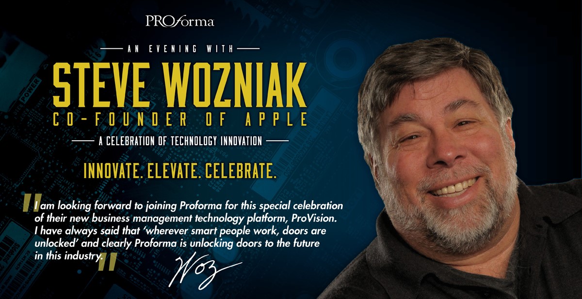 “I am looking forward to joining Proforma for this special celebration of their new business management technology platform,” says Wozniak. “I have always said that ‘wherever smart people work, doors are unlocked,’ and clearly Proforma is unlocking doors to the future in this industry.”