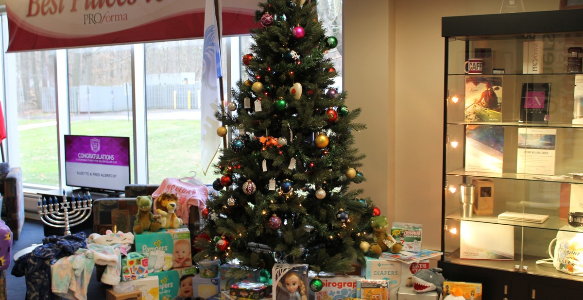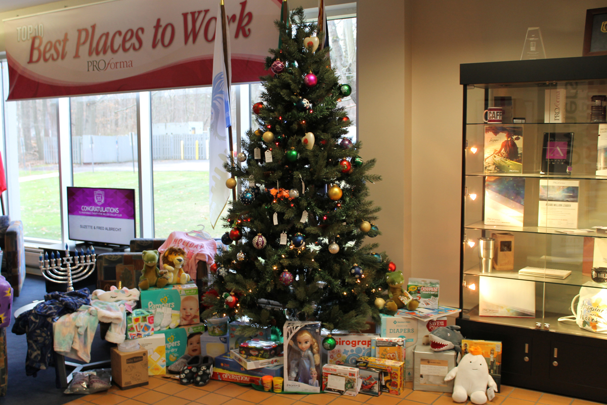 Earlier this month, Proforma’s adopt-a-family fundraiser was held in support of a family with five children. Proforma team members took wish list gift tags from their office Christmas tree and purchased gifts for the family. Every gift tag on the tree was taken and the associated gifts were purchased for the family. Toys, clothes, board games and other items were collected as presents for the family to open and enjoy during the holidays. In addition to the collection of gifts, Proforma also raised $250 to purchase a gift card for the family.