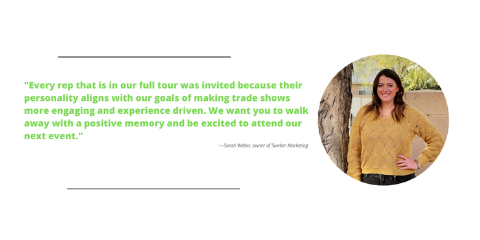 “We have such a good vibe with our current suppliers that it would take away from the experience of our clients if we add too many,” says Weber. “Every rep that is in our full tour was invited because their personality aligns with our goals of making trade shows more engaging and experience driven.