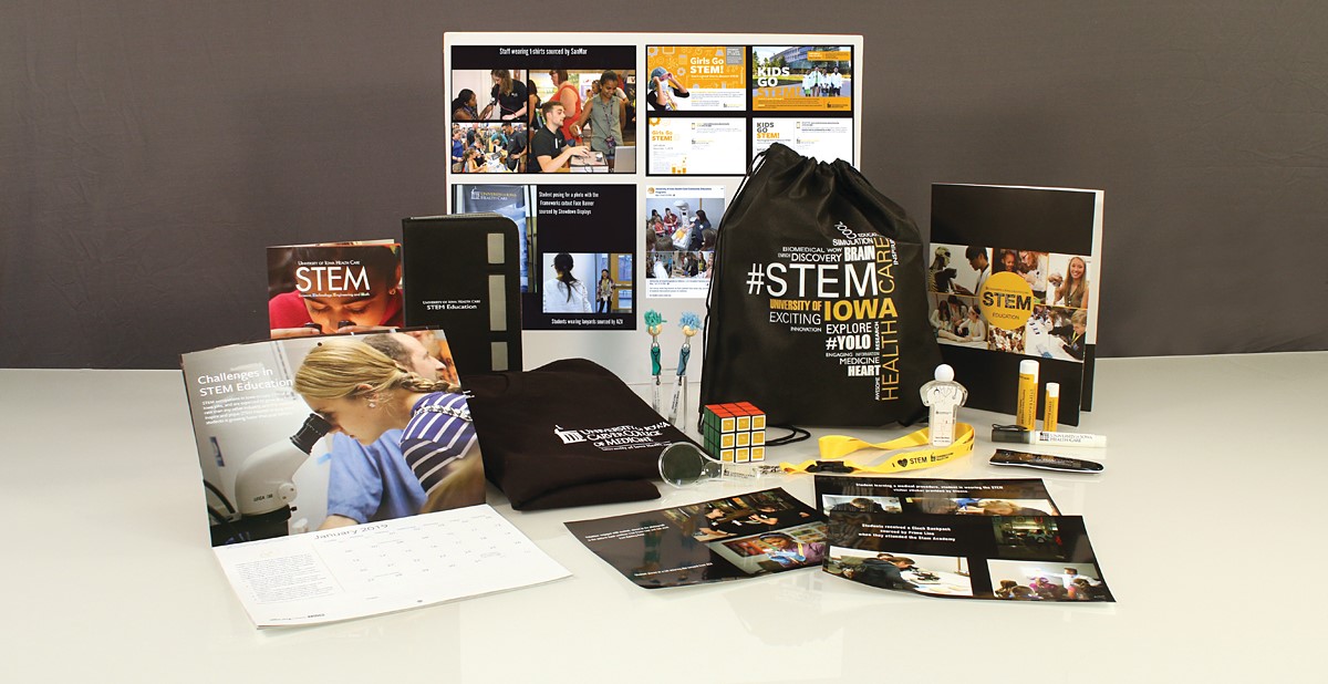 Team Iowa strategically selected products that represent science, technology, engineering and math for use during registration/check-in, lectures, tours and labs that are part of the University of Iowa Health Care STEM programs, while targeting the specific age demographic. Selected items featured a specially selected logo that was featured throughout the event, beginning with registration where participants received a cinch bag containing a folder with program information and a lanyard. The stand-out item was a Rubiks Cube that featured unique branding; a product that was recommended because it encourages problem-solving and critical thinking, which are two fundamental skills sought after in STEM professionals. A custom calendar was also created by the college print division and given to professors, schools and legislators.