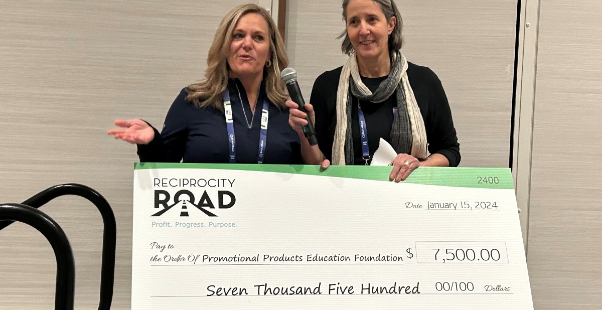 At a partner reception on Monday evening, during The PPAI Expo 2024, Reciprocity Road (PPAI 769354, A00) presented a $7,500 check to Promotional Products Education Foundation.