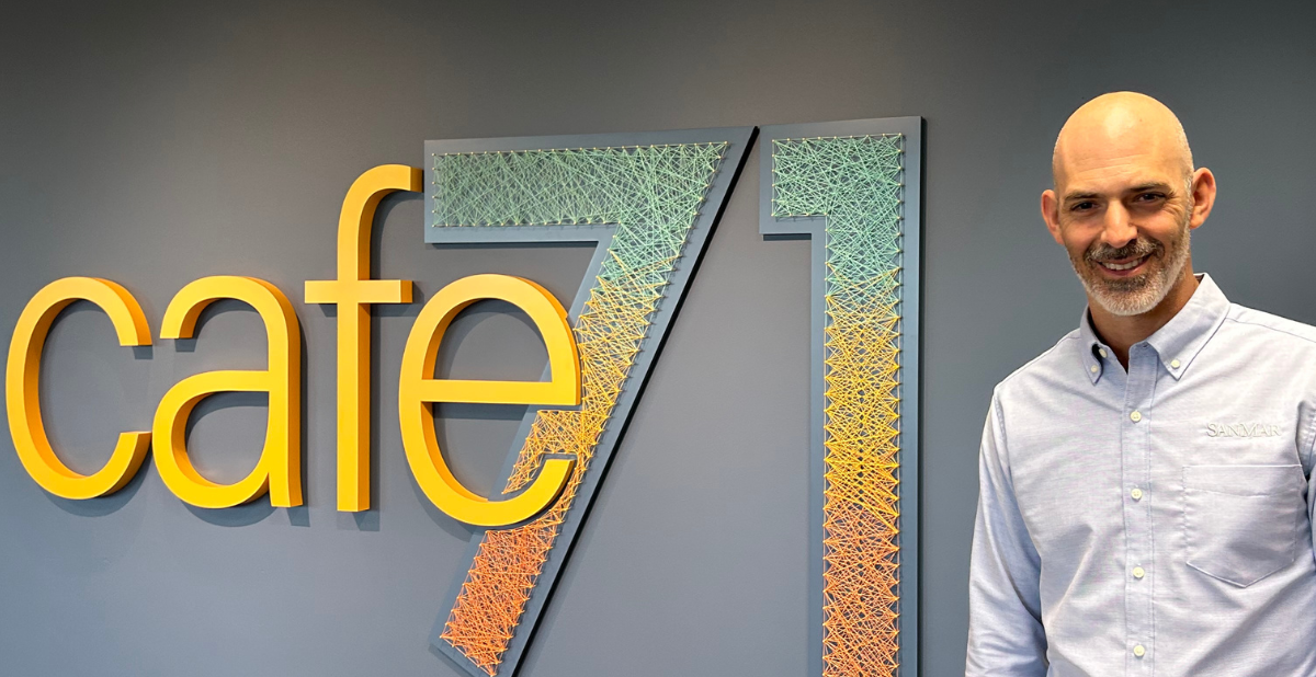 SanMar president Jeremy Lott stands at the entrance of cafe71, the staff dining hall at company headquarters, named in honor of SanMar's founding by his father Marty Lott in 1971.