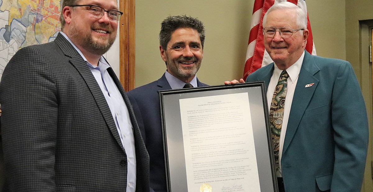 Shelbyville Mayor Wallace Cartwright and the state of Tennessee issued proclamations today recognizing May 14-18 as Promotional Products Work! Week. The city of Shelbyville, also known as The Pencil City, declared itself The Promotional Products City to acknowledge that promotional products companies and professionals are a vital component of an entrepreneurial and productive economy.