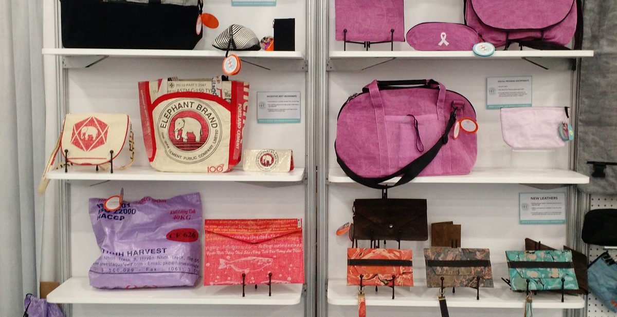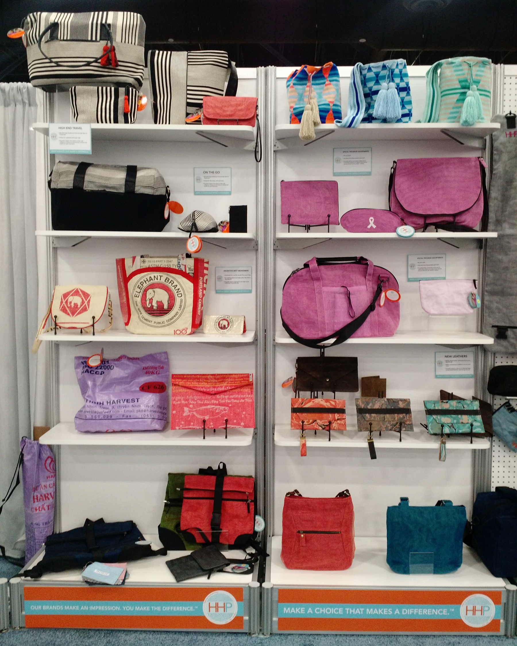 At HHP/Helping Hand Partners, Booth 536, unique accessories with a socially conscious mission were on display. Totes, handbags and clutches are made from ethically sourced materials by artisans around the world. Bags that once held cement get new life as unique messenger bags made by craftsmen in Cambodia, and one-of-a-kind tote designs are crafted in Guatemala.