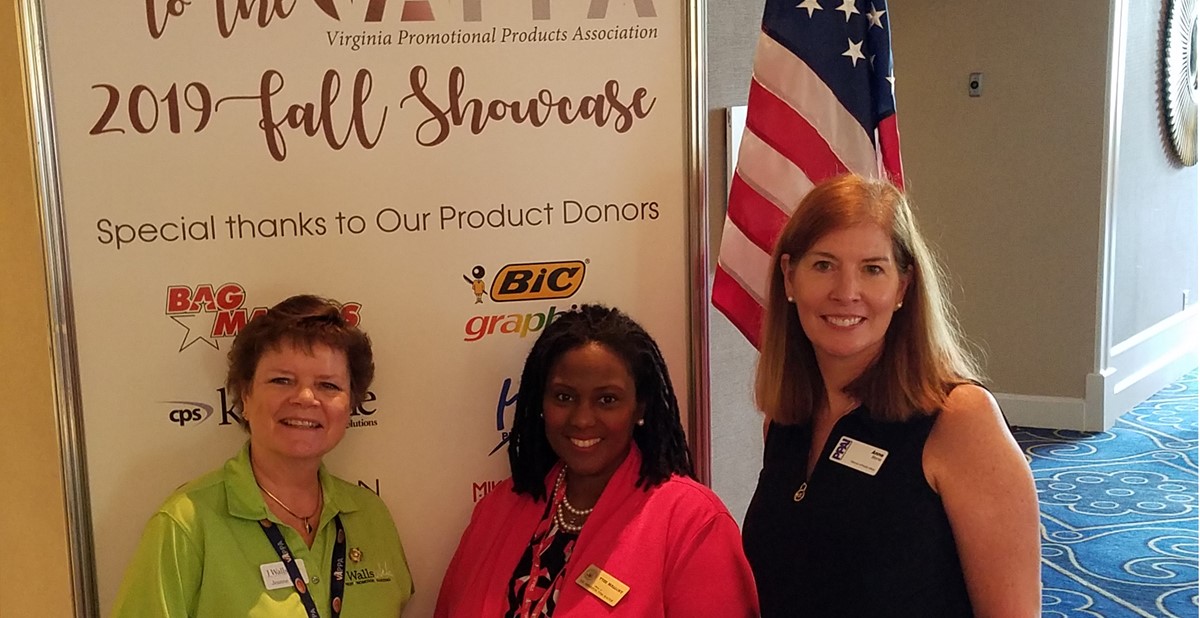 At the Virginia Promotional Products Association's Fall Showcase in Richmond, Virginia, on September 11, PPAI's Anne Stone (pictured on right), director of public affairs, presented a keynote on tariffs and product responsibility. Tyree D. Mallory (center), regional director for central Virginia, who works in Virginia Senator Tim Kaine's office, was also present at the invitation of Jeanne Walls (left), president of distributor JWalls Ink in Richmond. The pair met during PPAI’s Legislative Education & Action Day in Washington, D.C. in May.