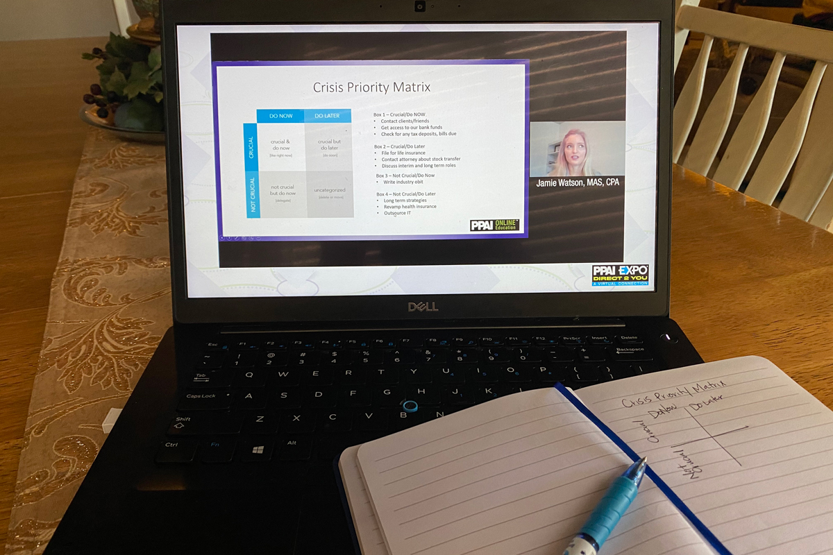 Kicking off this year’s educational sessions for the PPAI Expo Direct-2-You, Jamie Watson, MAS, CPA, senior financial analyst at Certified Marketing Consultants LLC, led hundreds of attendees through “Plan C(risis): Building A Resilient Company.” In this straightforward 52-minute virtual session, Watson discussed what a crisis looks like and describes the different types of crises a business can face. Attendees left with actionable planning strategies and best practices to set their companies up for success.