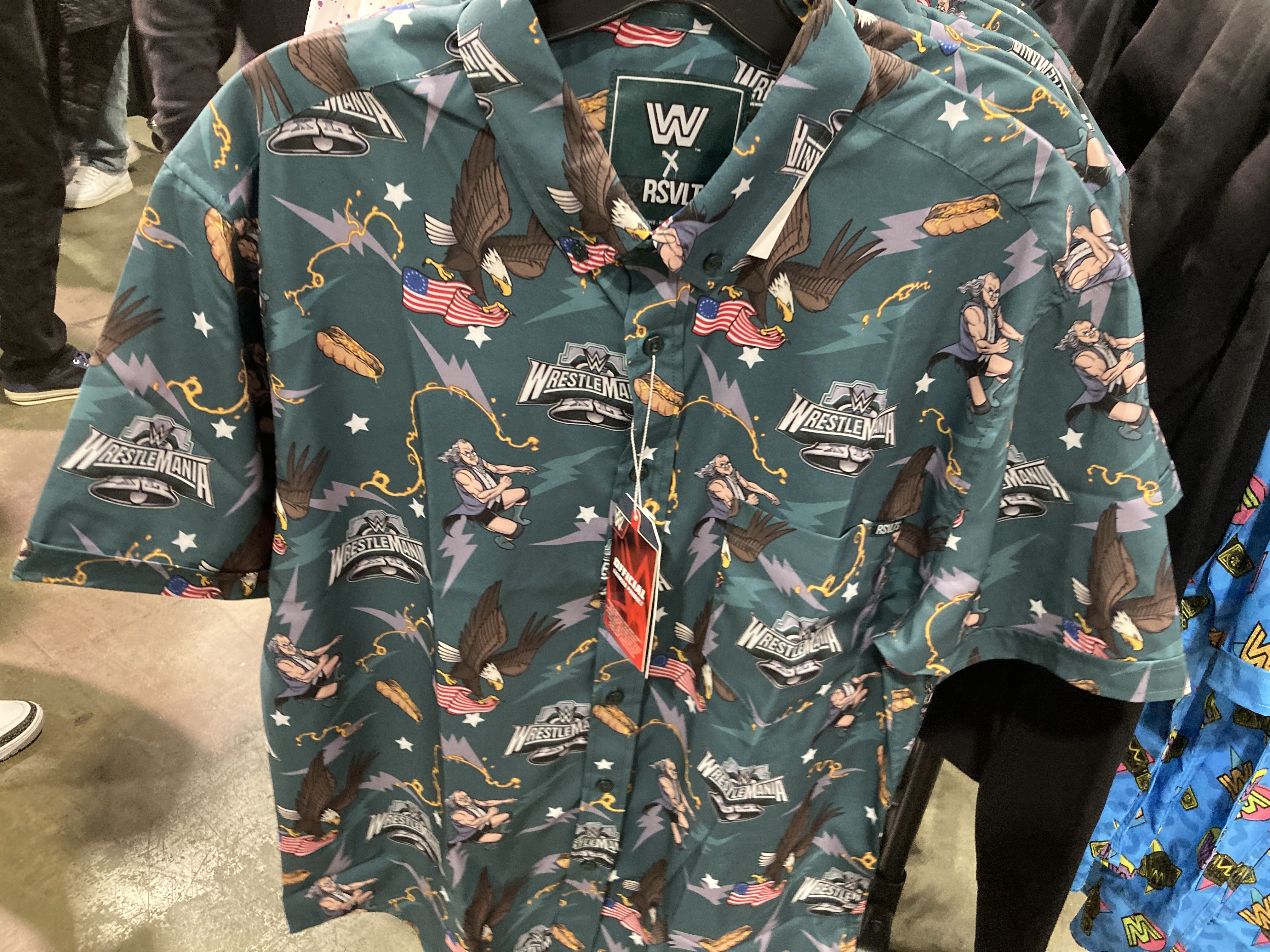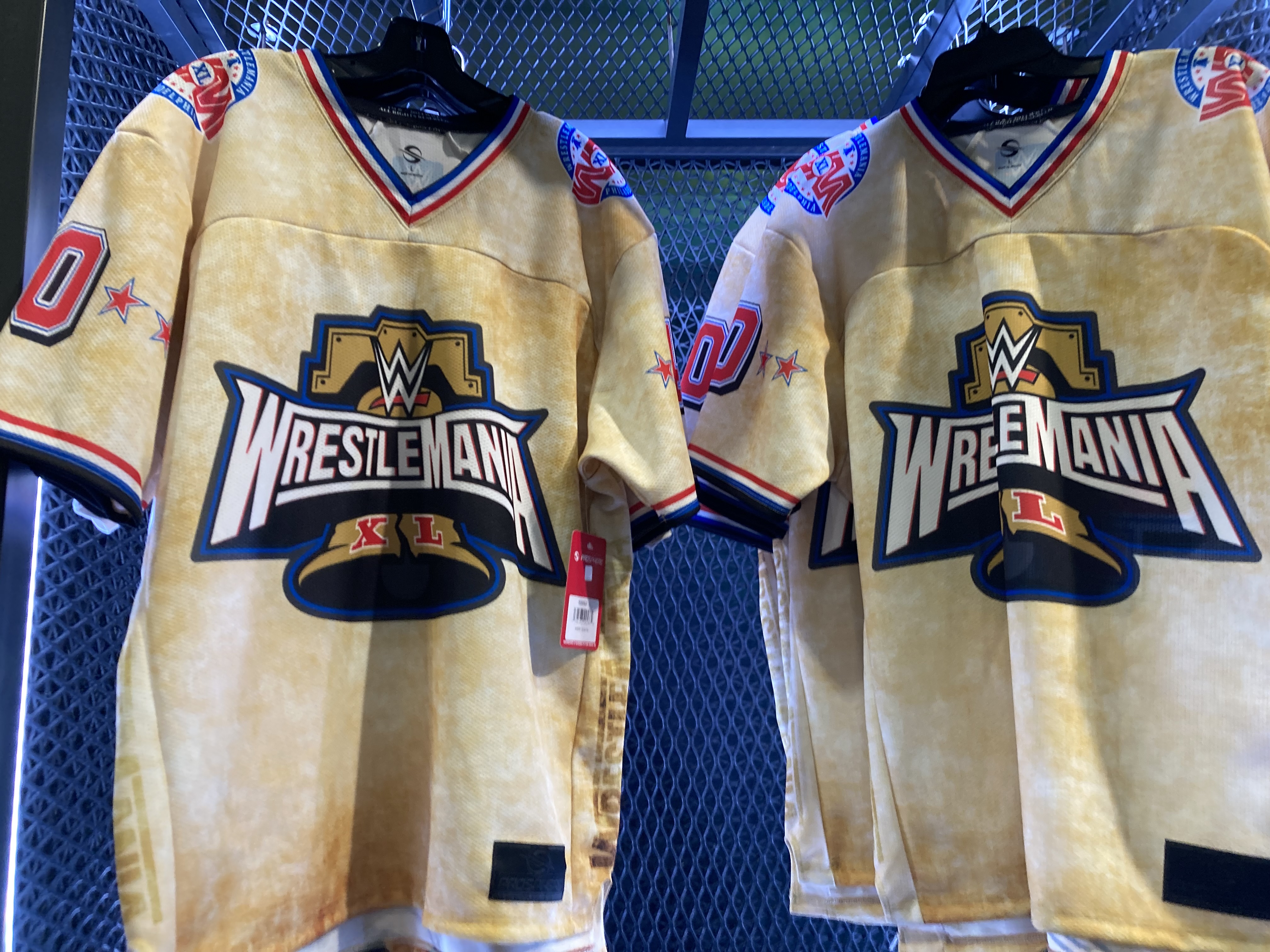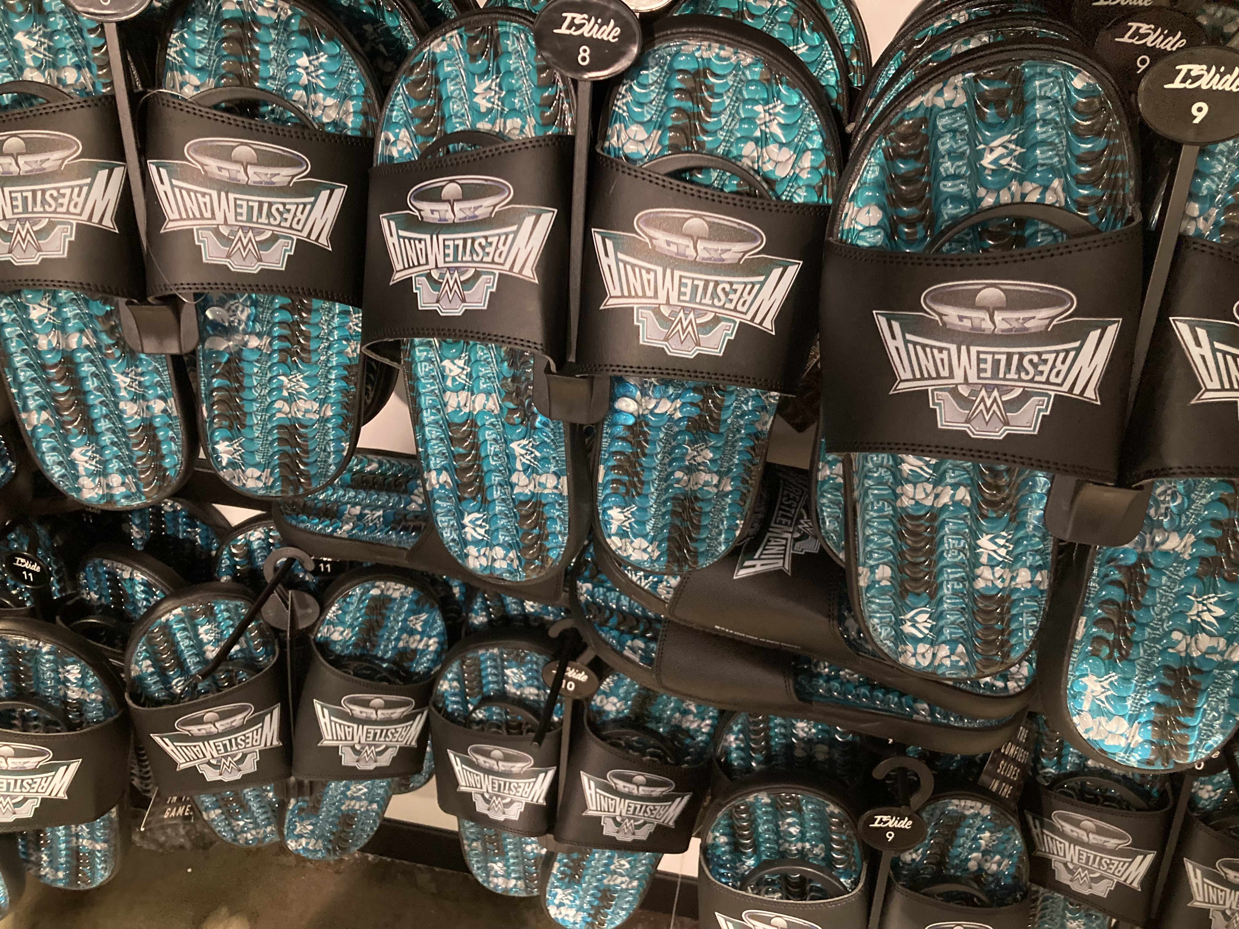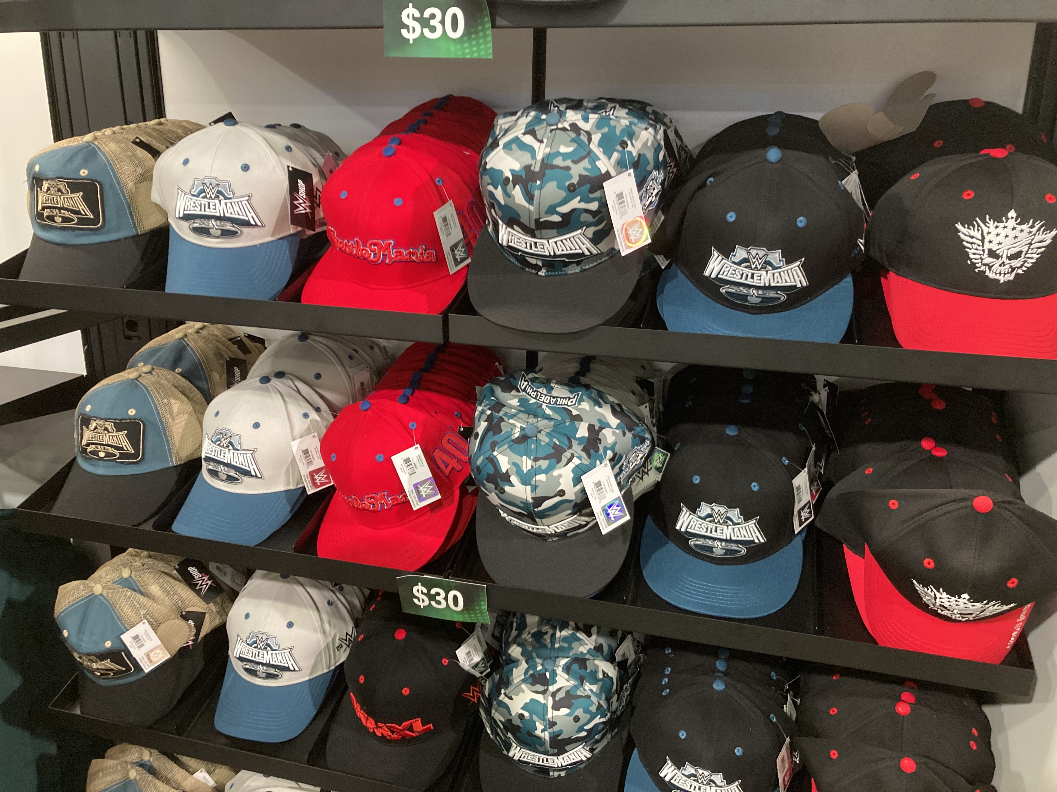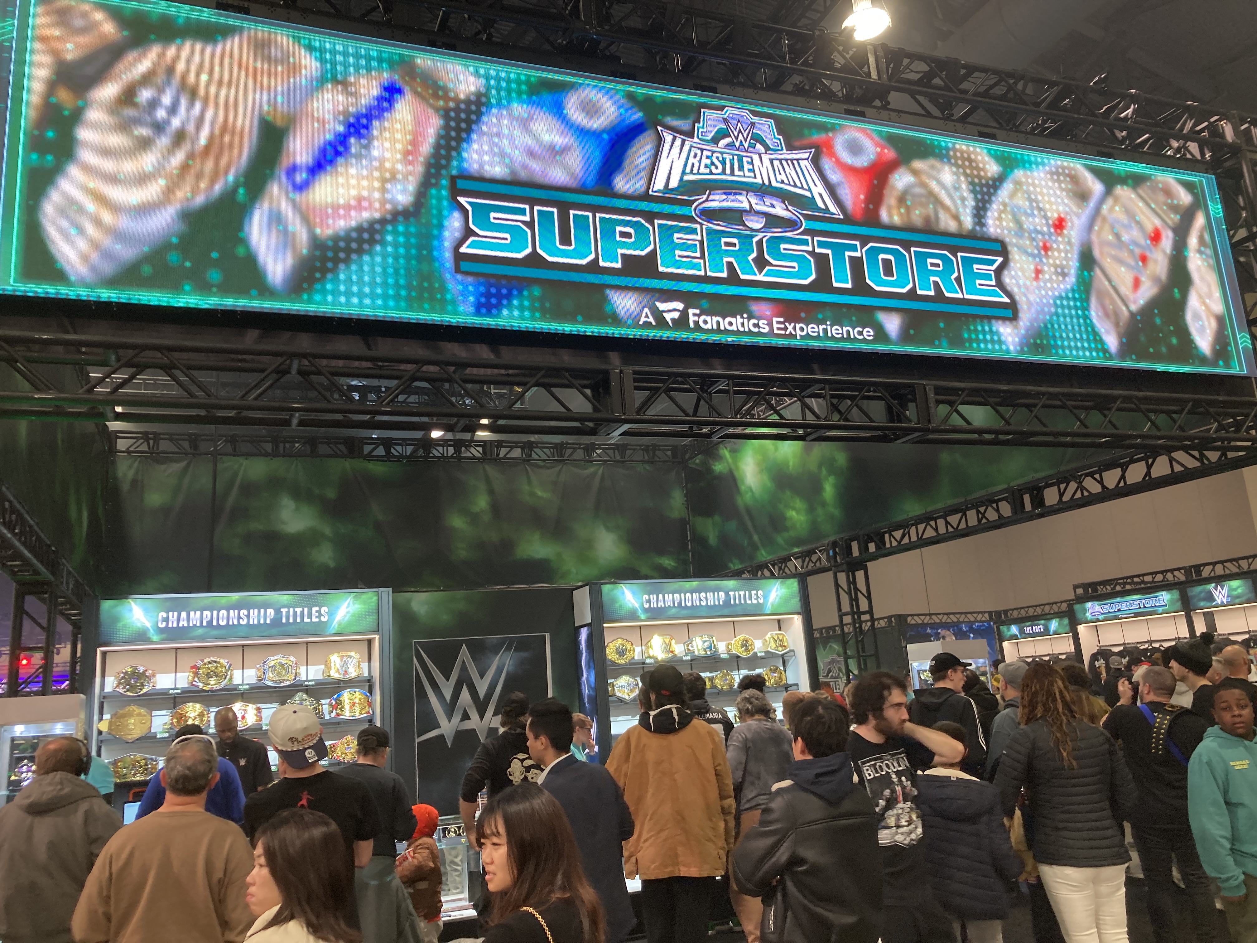The WrestleMania Superstore served as a treasure trove for branded merchandise, featuring T-shirts, hats, championship belts, bags, pendants, flip flops, jackets, hoodies, vests, golf polos, masks, Funko Pop figures and more.