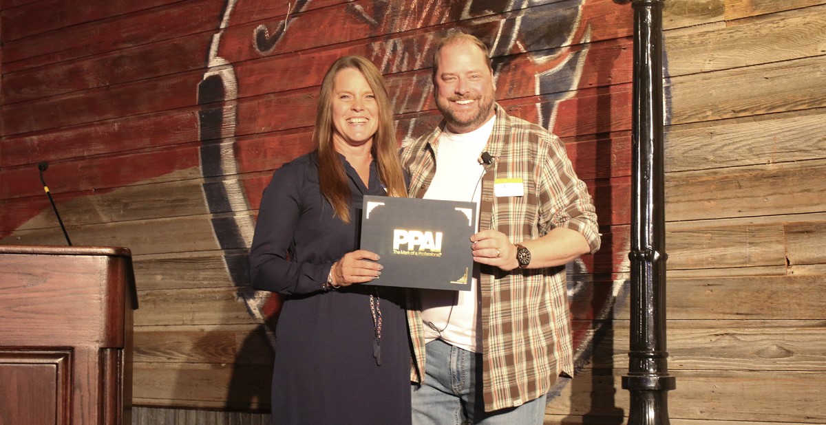Last night, Leadership Development Workshop (LDW) attendees donned their boots and cowboy hats for an evening of live music, dancing and recognizing their industry peers’ accomplishments. Held at the rustic and very “Texas” Austin Ranch banquet hall adjacent to the Hilton DFW Lakes hotel, LDW’s event hotel, the evening celebrated Tom Carpenter, MAS, national accounts manager at Minnesota-based Fey Promotional Products Group and recipient of the 2019 PPAI RAC (Regional Association Council) Volunteer of the Year award, and Tiffany Kanak, executive director of the Chesapeake Promotional Products Association (CPPA) and the Promotional Products Association Midwest (PPAMidwest), who was presented with the 2019 Donna Hall Memorial Grant.